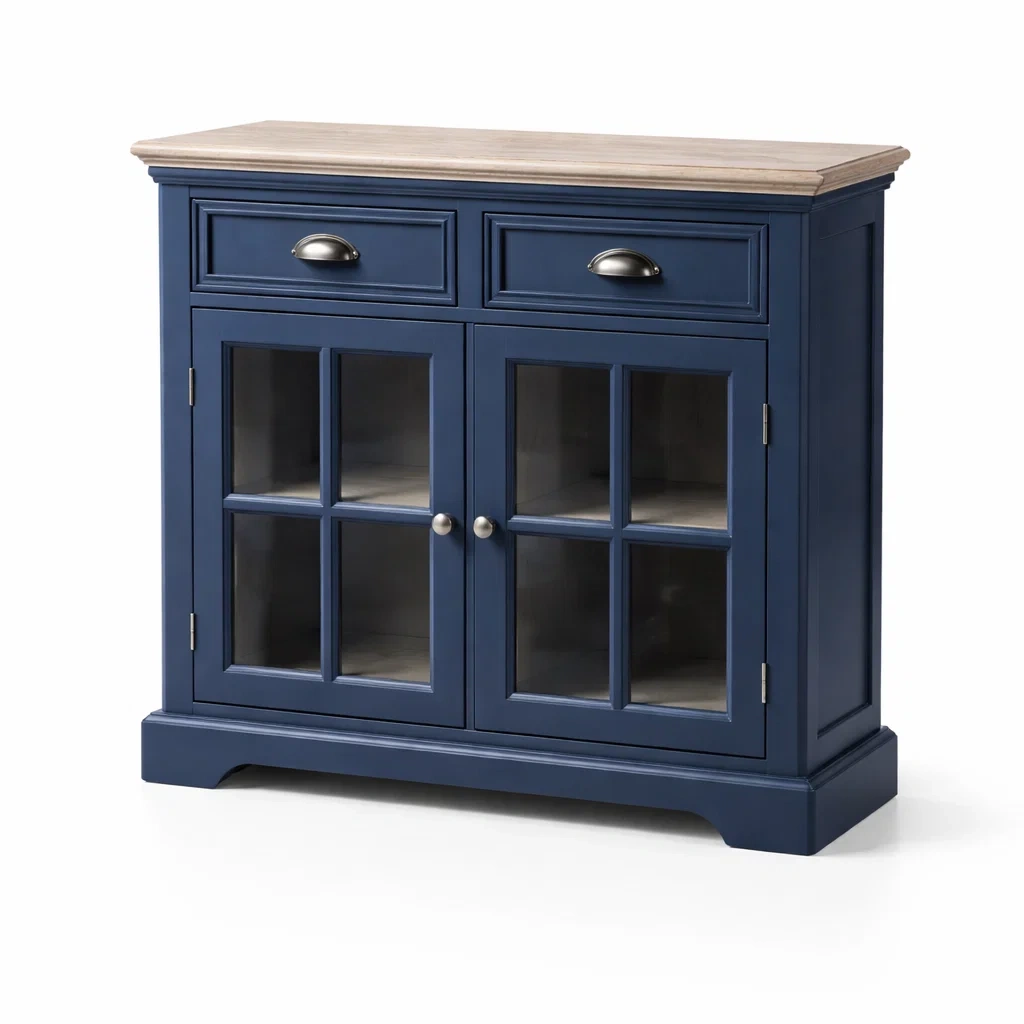 Buffet en bois MDF bleu avec portes en verre trempé 90x40x85 cm