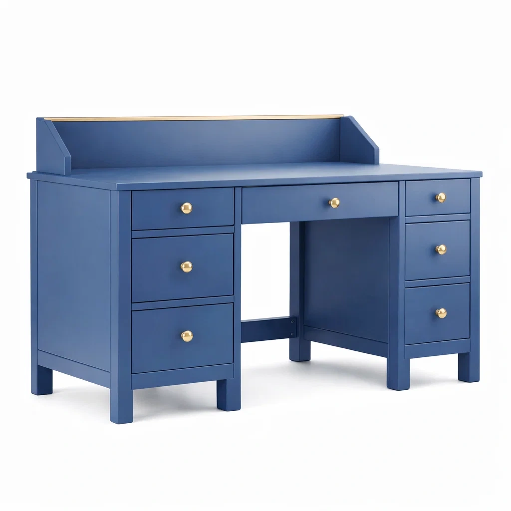 Bureau en bois avec étagères et tiroirs de rangement bleu