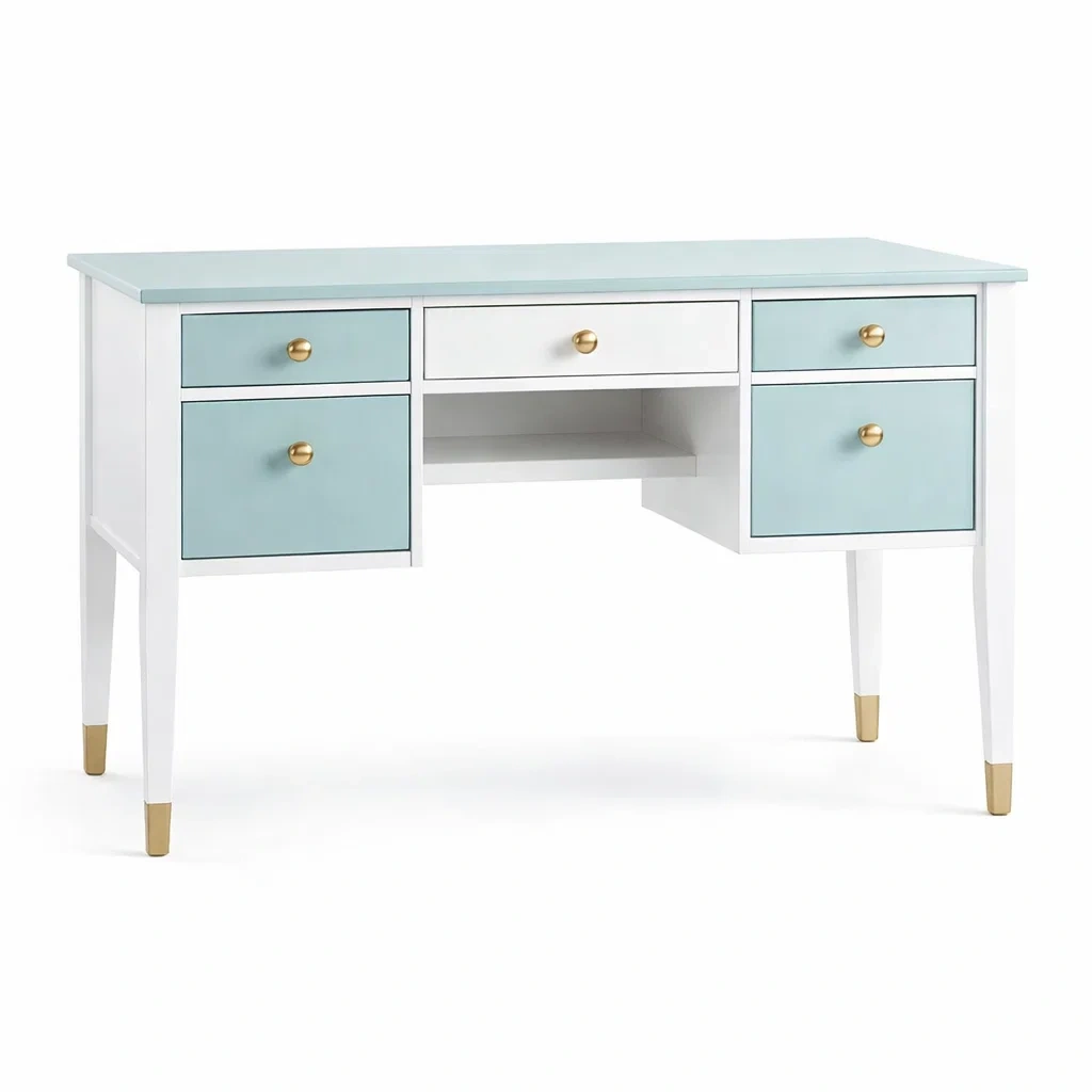 Bureau en bois avec tiroirs bleu et blanc