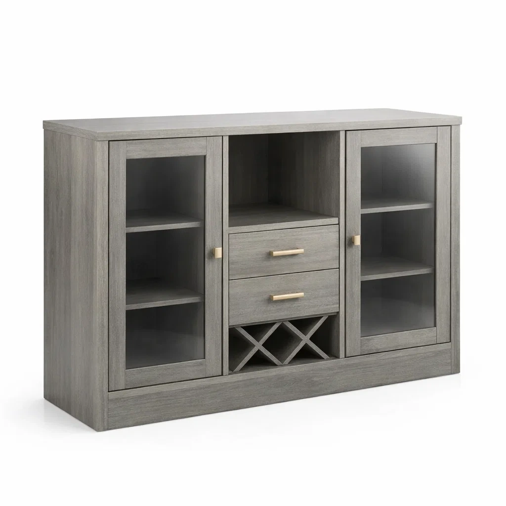 Stockage: 2 tiroirs, 2 portes vitrées, 1 compartiment ouvert, grille pour bouteilles