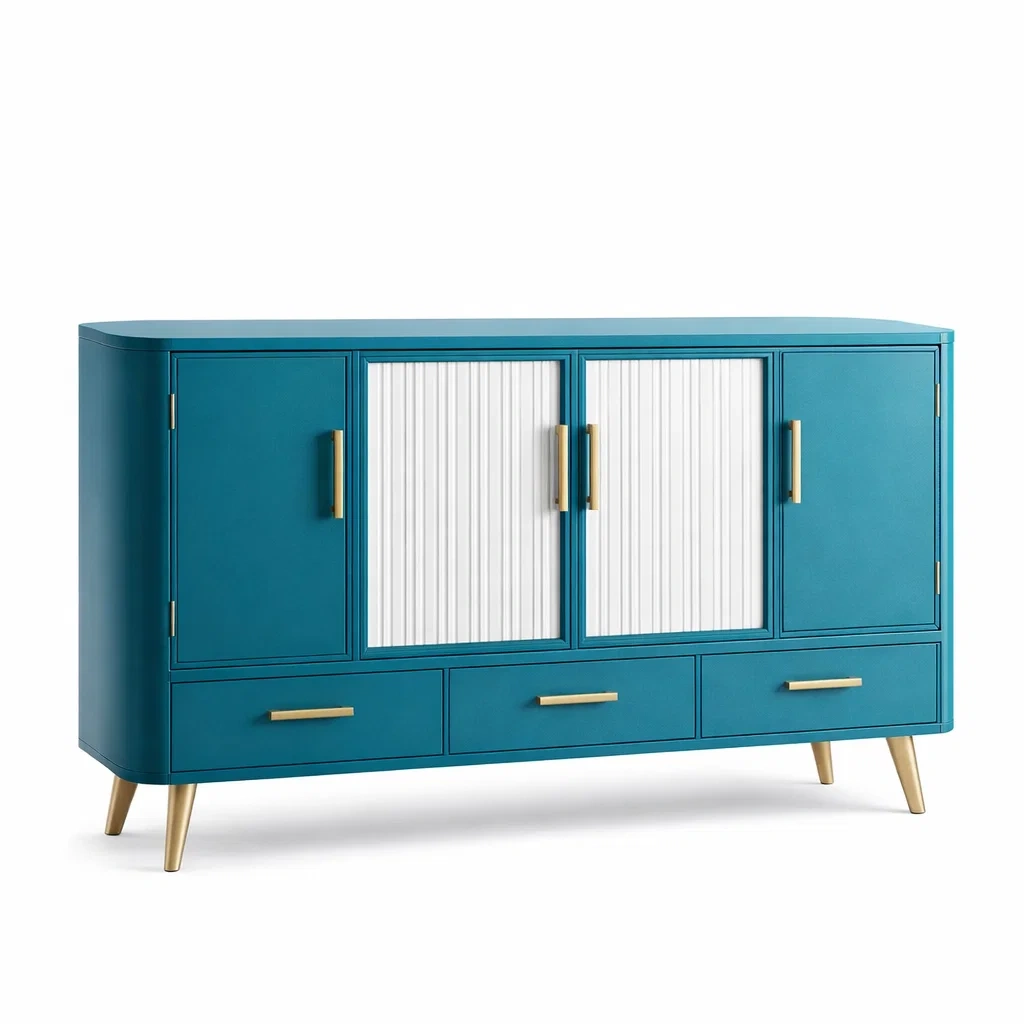 Buffet en bois bleu avec portes blanches et poignées dorées