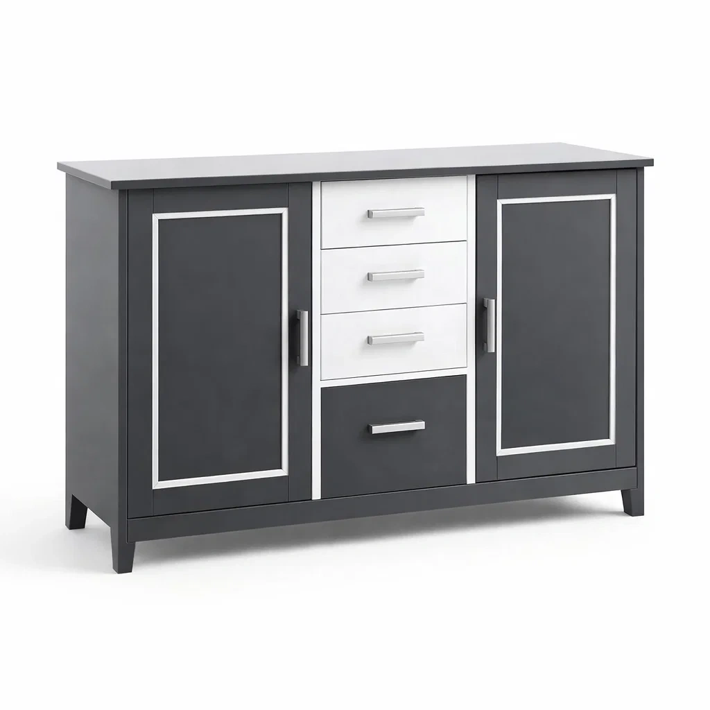 Buffet en bois composite gris et blanc avec 2 portes et 4 tiroirs