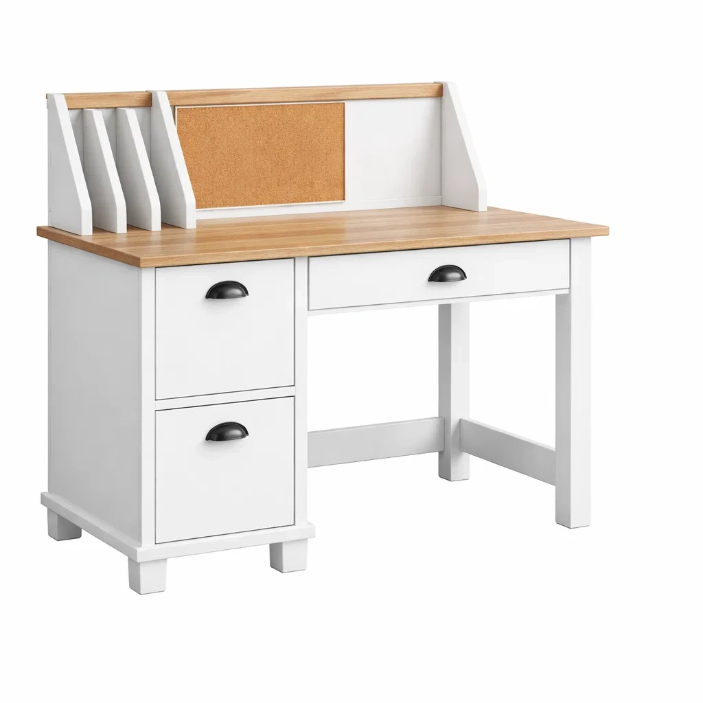 Le bureau est composé de MDF avec un placage de chêne sur la surface. Il présente une structure en MDF solide et durable. Le bureau inclut trois tiroirs spacieux pour le rangement et un panneau en liège pour fixer vos notes importantes.