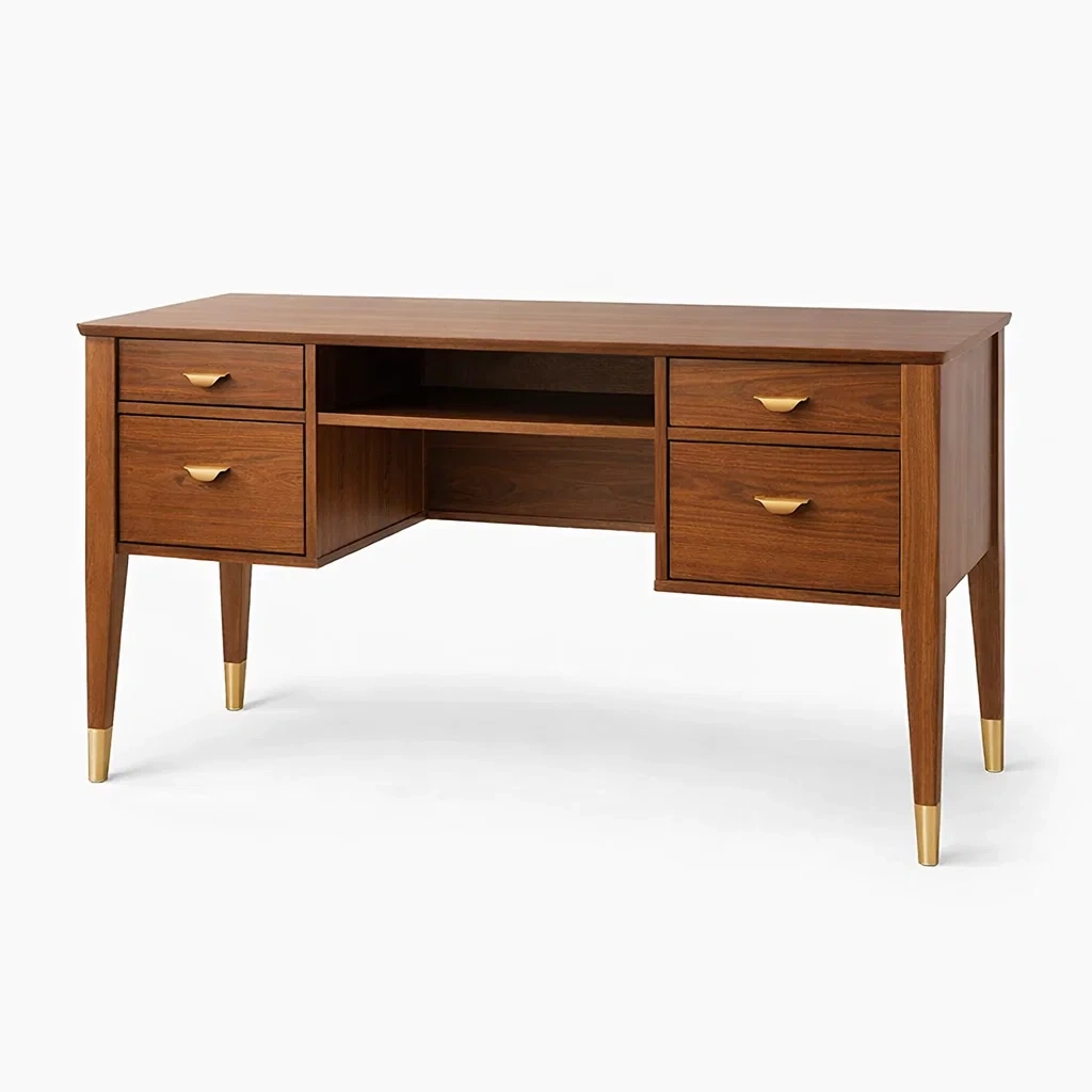 Ce bureau est fabriqué en bois de noyer avec des pieds et poignées en métal doré. Il dispose de quatre tiroirs et d'un compartiment central ouvert pour le rangement. Les pieds sont accentués de détails dorés pour un design élégant.