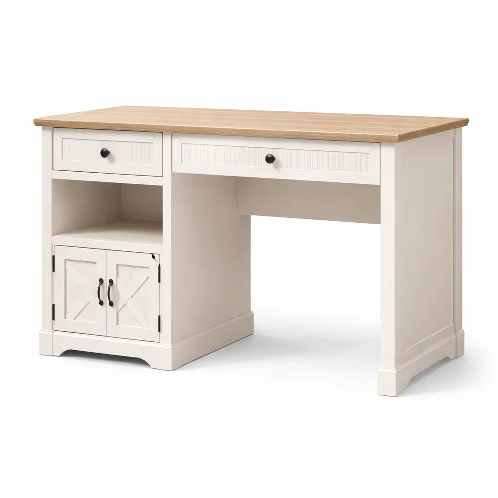 Structure fabriquée en panneaux de fibres de bois MDF. Le plateau est revêtu d'un effet chêne laminé. Le bureau offre un espace de rangement ouvert et une armoire avec des portes battantes, ainsi que deux tiroirs pour le rangement.