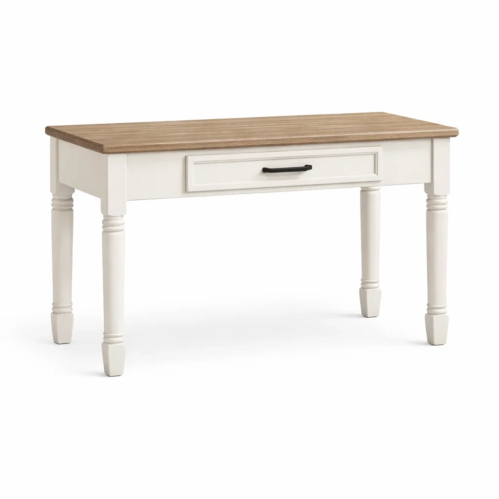 Plateau en bois stratifié avec une structure en bois massif et finition laquée. Bureau rectangulaire de 120 cm de longueur, 60 cm de largeur et 75 cm de hauteur. Couleur principale Blanc avec accent en bois naturel. Dispose d'un tiroir intégré pour le rangement.