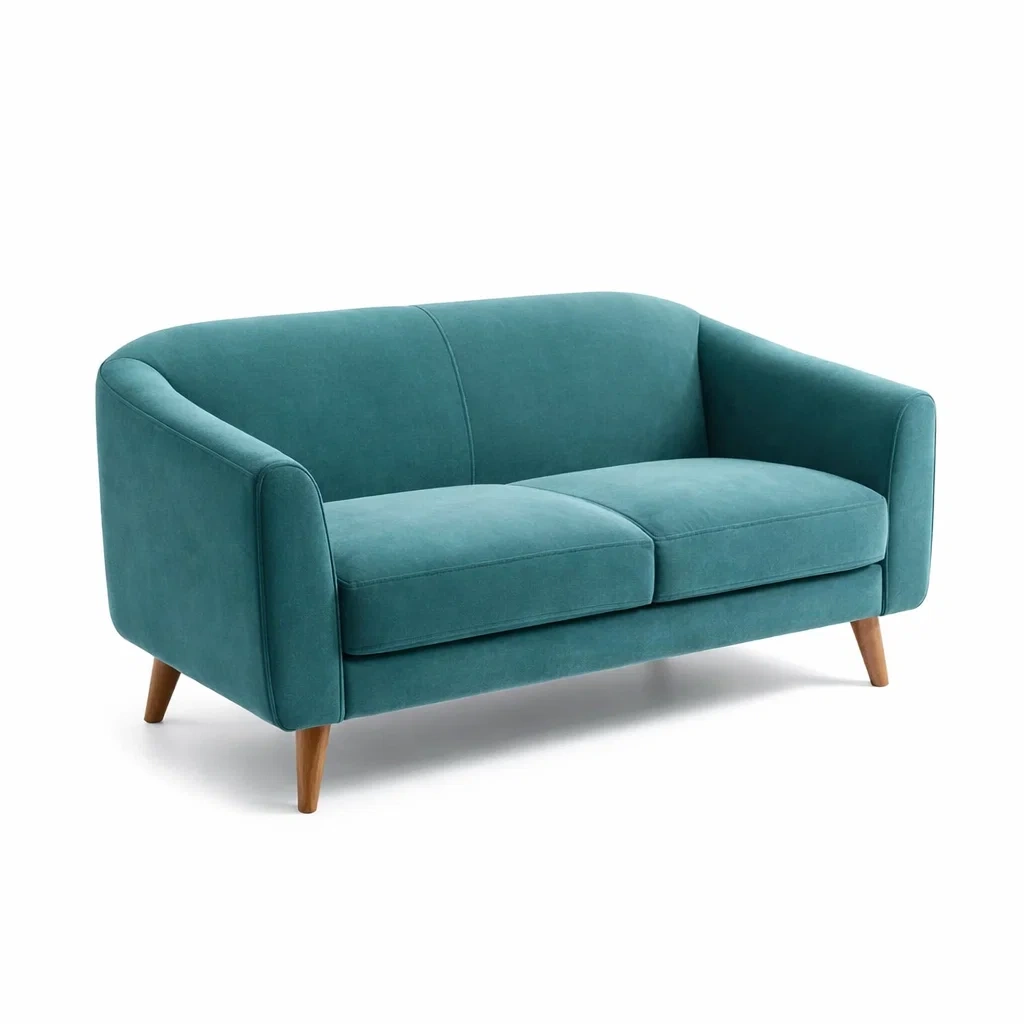 Ce canapé deux places est recouvert de tissu en polyester couleur turquoise. La structure est en bois massif pour garantir la durabilité.