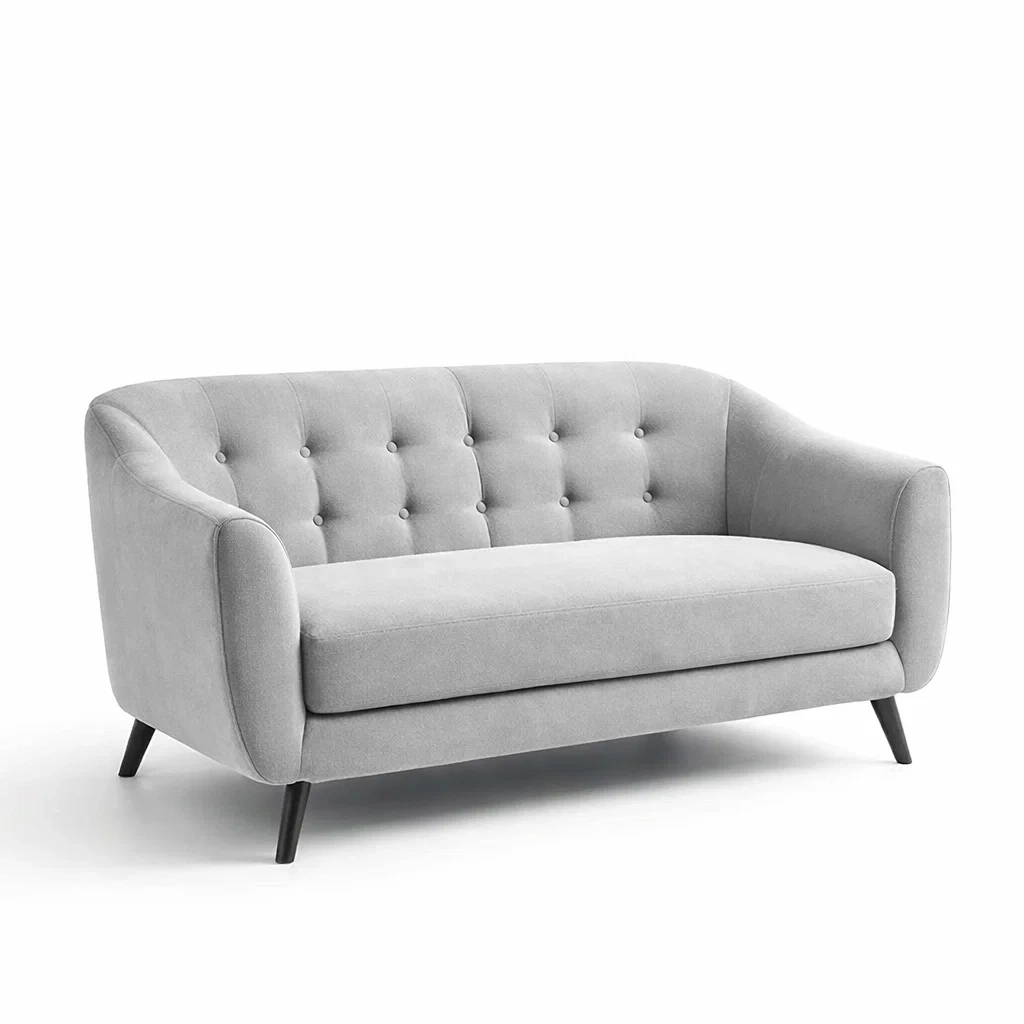 Ce canapé 2 places est recouvert de velours polyester de couleur grise. Il est doté d'un rembourrage en mousse polyuréthane offrant confort et durabilité. Les pieds sont en bois massif pour une stabilité accrue. Le dossier est de style boutonné, et les accoudoirs sont intégrés pour un design épuré.