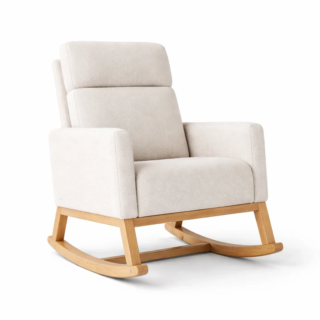 Ce fauteuil à bascule est fabriqué avec un cadre en bois de hêtre et un revêtement en tissu polyester. Le remplissage est en mousse de haute densité.