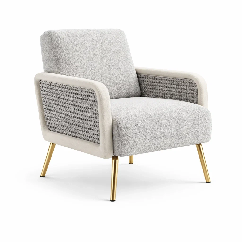 Le fauteuil est conçu avec une structure en bois massif, rembourré de mousse polyuréthane et recouvert d'un tissu en polyester. Les pieds sont en métal doré.
