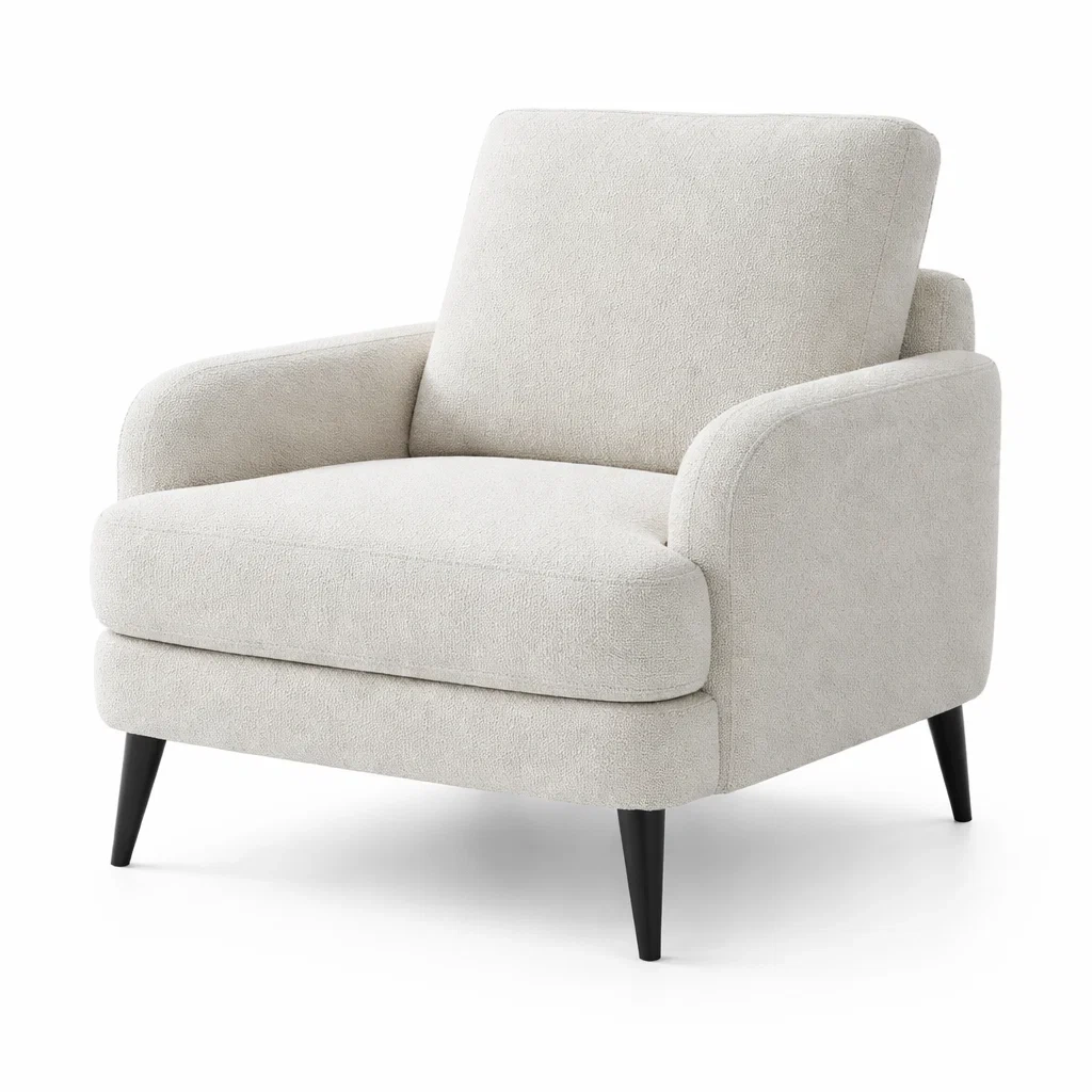 Ce fauteuil est recouvert d'un tissu bouclé en polyester blanc cassé et repose sur des pieds en bois massif. Les dimensions sont de 85 cm de longueur, 90 cm de largeur et 95 cm de hauteur. Les accoudoirs fixes offrant un soutien. Le poids du produit est de 15 kg. Pour l'entretien, nettoyez avec un chiffon humide.