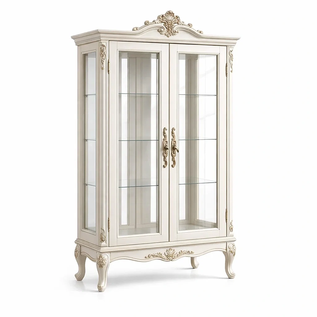 Cette vitrine est fabriquée en bois massif et dotée de portes en verre trempé de 6 mm.